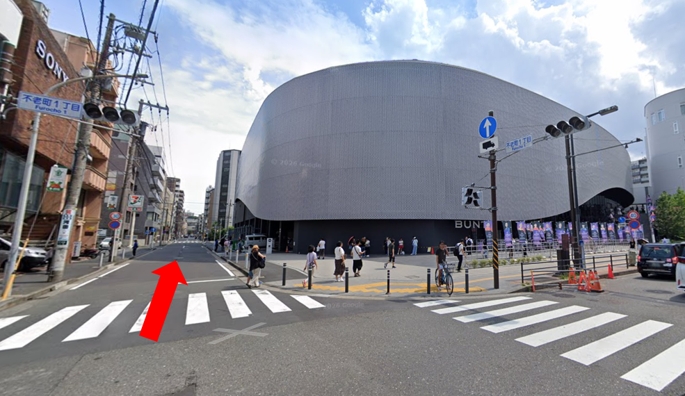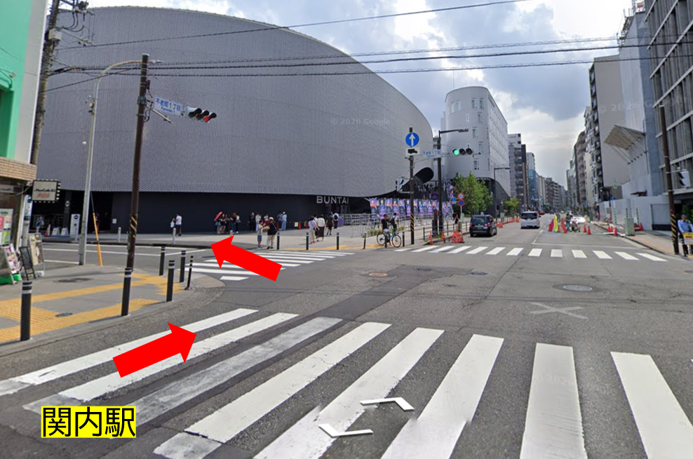 ① 会場の正面入口が見えましたら、建物に沿って左手方向へお進みください。
